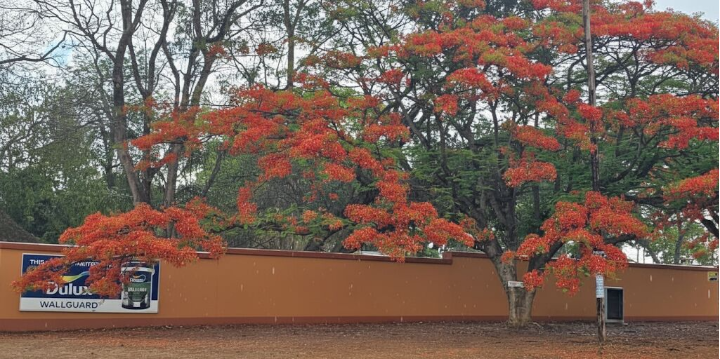 A Fiery Crown in Full Bloom - The Flamboyant Tree The flamboyant tree (Delonix regia), also known as the flame tree or royal poinciana, is famous for its fiery red-orange blossoms and wide, umbrella-like canopy.