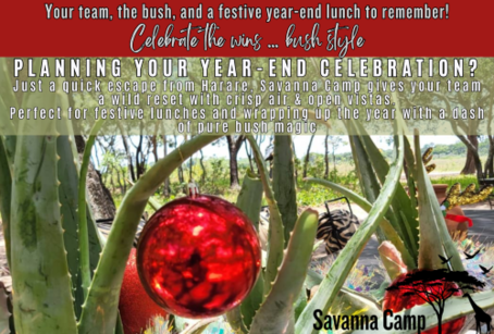 SAVANNA CAMP - EXCLUSIVE OFFER Book 20+ delegates for a bush-style Xmas lunch and get a complimentary midweek glamping overnight stay for 2 in one of our private tented camps - the perfect treat for colleagues, valued clients or treating yourself. WhatsApp: +263 77 987 8773 Email:[email protected] /www.savannacamp.com