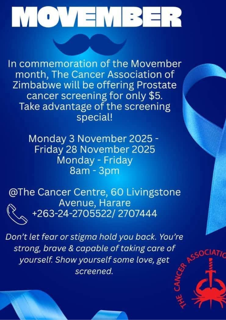 Movember Prostate Screening | Monday 17th to Friday 28th November | 8 am - 3 pm US$5 | Don't let stigma or fear hold you back. Show yourself some love and get screened today | Book your appointment now. Contact: The Cancer Association of Zimbabwe | 0242 705 522| 0242 707 444