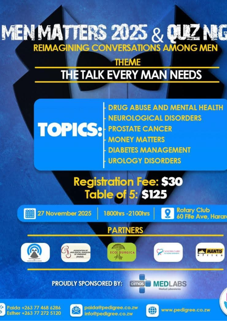 Thursday 27th November | 6pm - 9pm | US$30 per person | US$125 per table of 5 | Rotary Club 60 Fife Avenue, Harare. We'll be tackling tough topics like: ♤ Drug abuse and mental health ♤ Prostate cancer ♤ Money matters ♤ Diabetes management ♤ Urology disorders. Contact Paida: +263 774 686 286 Esther: +263 772 725 120