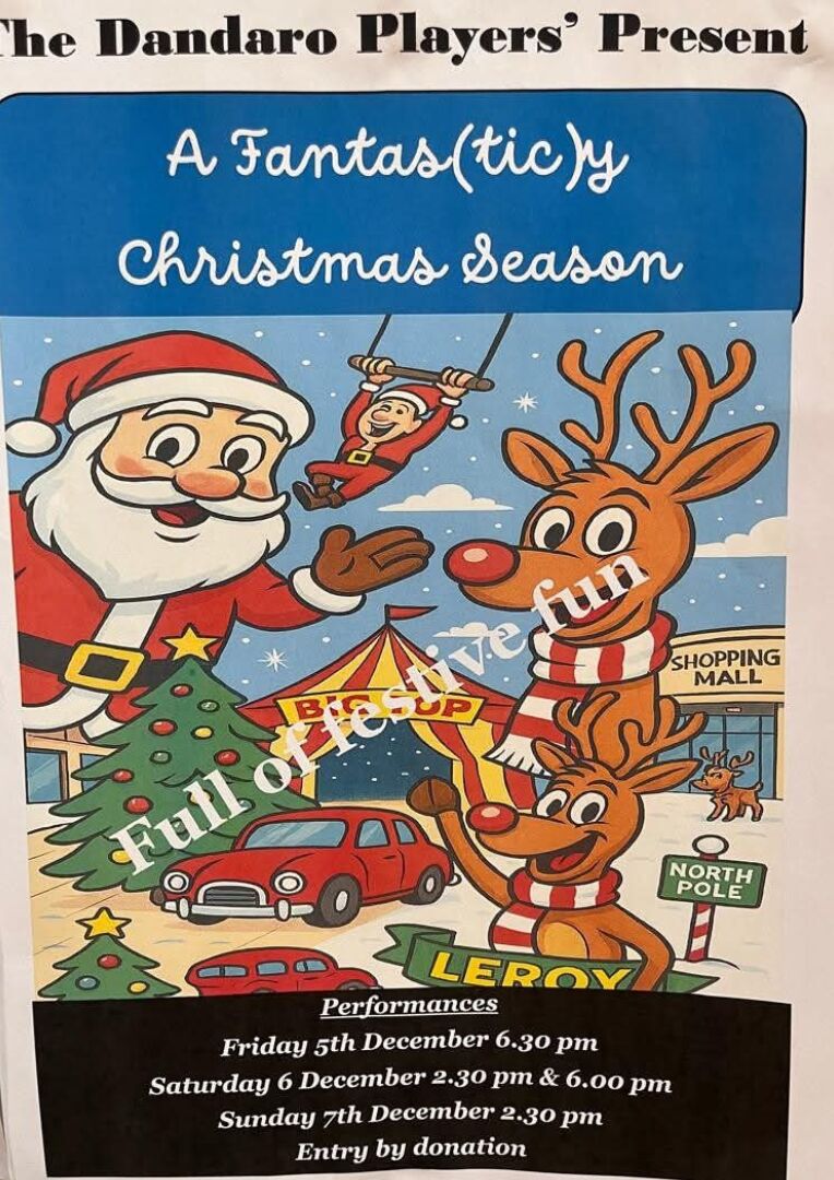 The Dandaro Players' Present Friday 5th - 6:30 pm Saturday 6th - 2:30 pm and 6 pm Sunday 7th - 2:30 pm Entry by donation. It's Christmas time at Dandaro, and join in the fun at the Dandaro Community Hall. Fun for the whole family.