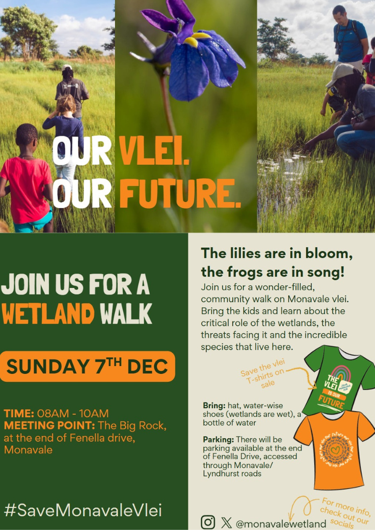 Join For a Wetland Walk Sunday 7th December Time: 8 am - 10 am Meeting point: The Big Rock, at the end of Fenella drive, Monavale Bring a hat, water-wise shoes, and a bottle of water. #SaveMonavaleVlei #Our vlei Our Future