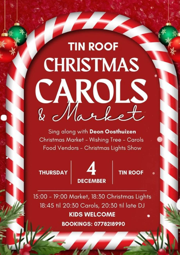 Tin Roof Carols and Market Thursday 4th Dec 3pm - late Sing-a-long ๐ Carols ๐ Wishing Tree ๐๐ Light Show ๐ Market ๐ Food. Kids are welcome to join in the fun. Limited seating so book your spot now: +263 778 218 990 #tinroofbucketbarbistro
