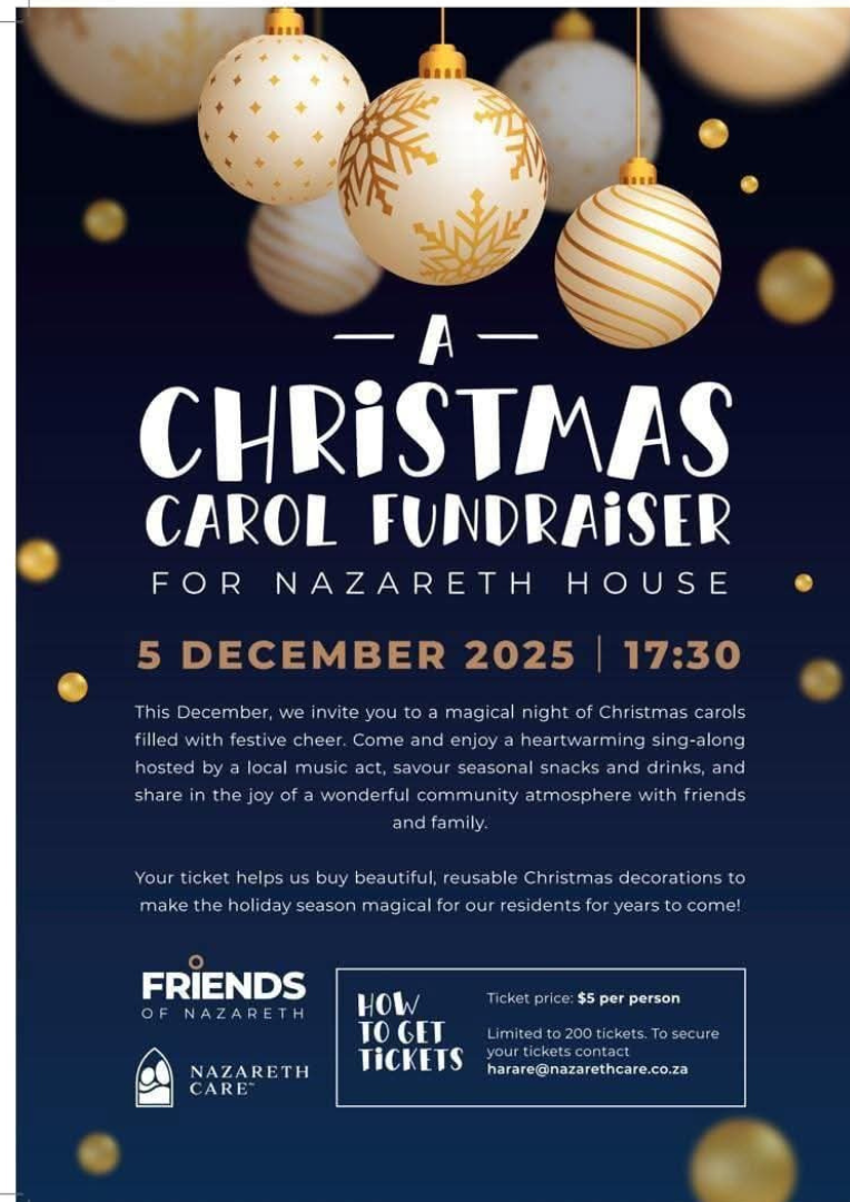 A Christmas Carol Fundraiser Friday 5th December5:30pmUS$5 We invite you to a night of carols filled with festive cheer. Come and enjoy a heartwarming sing-a-long , savour seasonal snacks and drinks, and share in the joy of a wonderful community atmosphere with friends and family. Christmas-themed stalls. US$10 Contact Kassie:+263 772 369 852