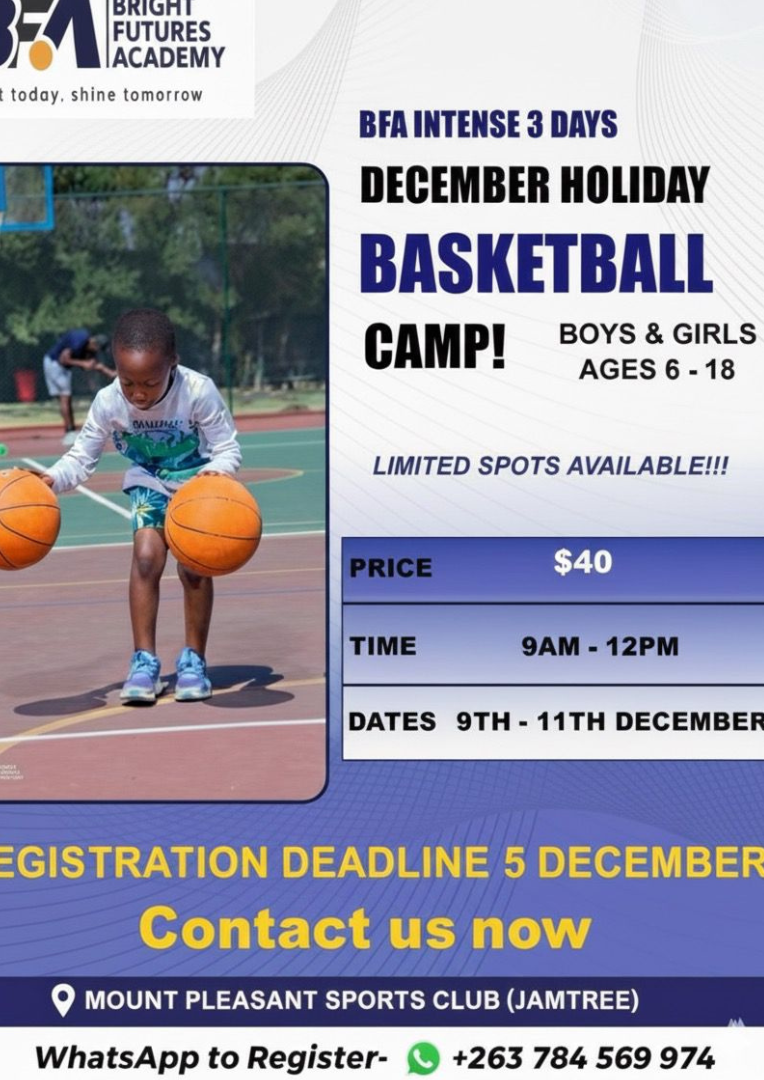 December Holiday Basketball Camp Boys and Gilrs Ages 6 to 18 Dates: 9th to 11th December Mount Pleasant Sports Club Price: $40 Registration Deadline is 5 December WhatsApp to register +263784569974