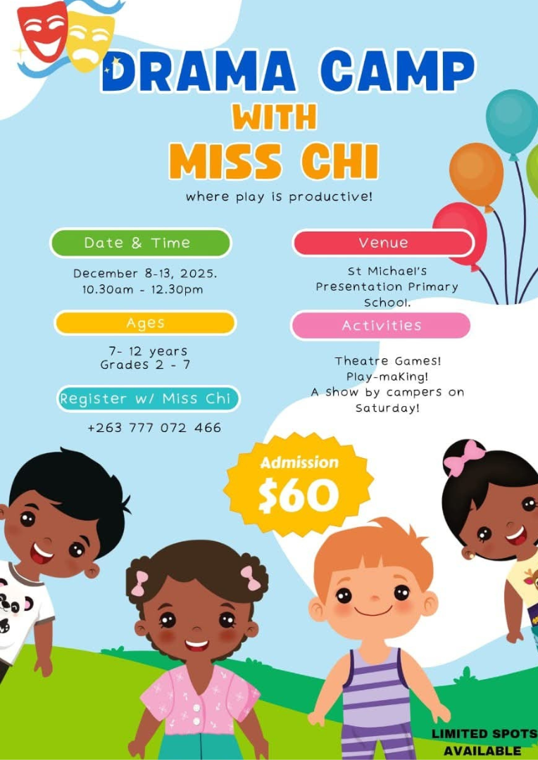 Drama Camp With Miss Chi Monday 8th to Saturday 13th 10:30 am - 12:30 pm - US$60 Sign up for Drama Camp with Miss Chi: where play is productive.๐ญ On the last day of camp the kids present the original show they've been working on all week. Theatre games ๐ญ Play making ๐ญ Concert. Perfect for children aged 7 - 12. Book a spot for your child now. Contact Miss Chi:+263 777 072 466