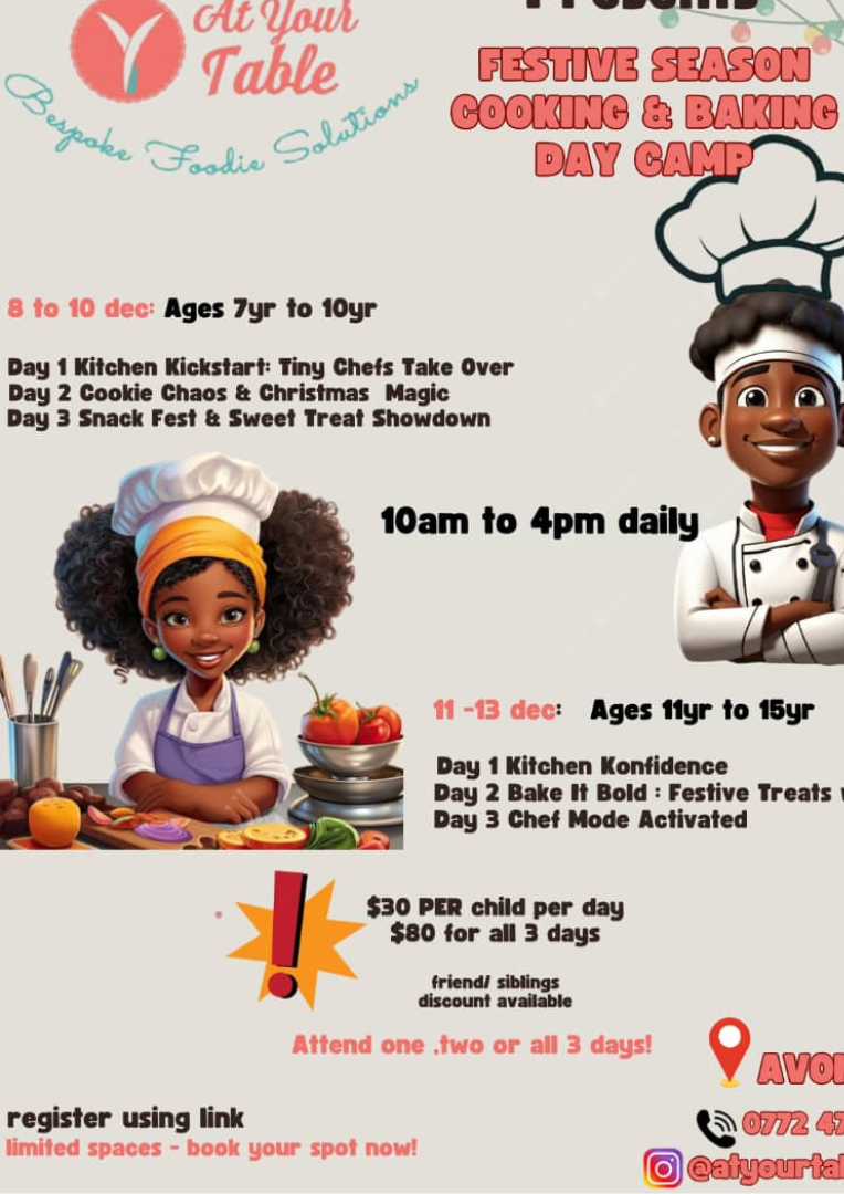 Christmas Cooking Camp ๐จ 7 - 10 years old: Monday 8th - Wednesday 10th December ๐จ 11 - 15 years old: Thursday 11th to Saturday 13th December 10am - 4pm. US$30 per day US$80 for 3 days. Includes ingredients. Each group gets three fun, hands-on days of cooking, baking, creativity, and holiday magic. Spaces are limited, so please register early using the link below. For more information contact:+263 772 470 472