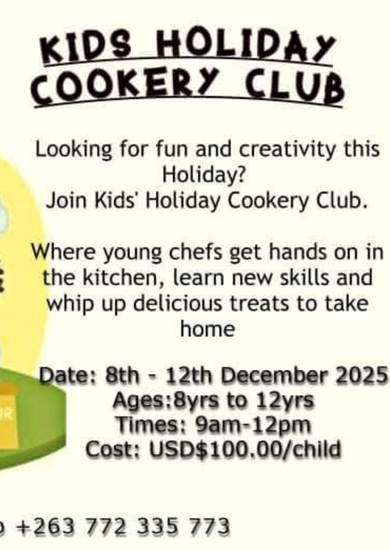 Kids Holiday Cookery Club Dates: 8th to 12th December Ages: 8 yrs to 12 yrs Times: 9 am to 12 pm Cost: $100/child Looking for fun and creativity this holiday? Where young chefs get hands on in the kitchen, learn new skills and whip up delicious treats to take home For further information, WhatsApp +263772335773
