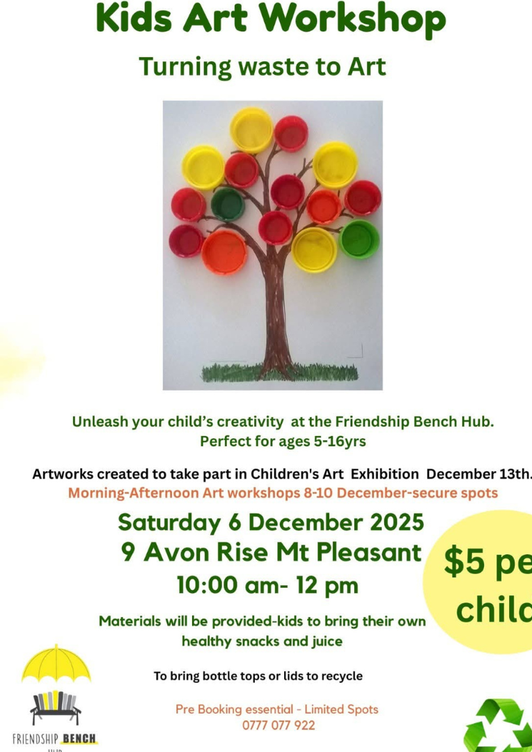 Kids Art Workshop โ Recycling Edition Saturday 6th December 10 am - 12pm. US$5 Includes materials. โป Kids aged 5 - 16 are encouraged to join in the recycling fun and to bring bottle tops and/or lids. โป๏ธ Bring juice or water and a healthy snack. Booking is essential as we have limited space at The Friendship Bench Hub +263 777 077 922