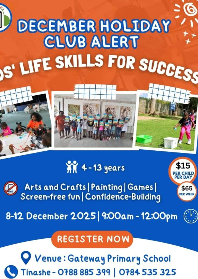 Kids Life Skills For Success Monday 8th - Friday 12th December 9am - 12pm US$15 per day US$65 for 5 days. Screen-free fun for kids aged 4 - 13. Arts โก Crafts โก Games โก Painting โก Confidence building โก Meet new peopleโก Make new friends. Book a place for your child today. Contact Tinashe: +263 784 535 325 +263 788 885 399