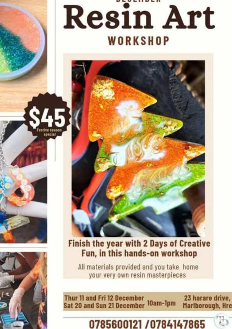Resin Art Workshop Dates: Thur 11th Dec/Fri 12 Dec Sat 20th Dec/Sun 21st Dec Time: 10 am to 1 pm $45 Festive Season special 23 Harare Drive, Marlborough All materials provided and you take home your very own resin masterpieces Book now: 0785600121 / 0784147865