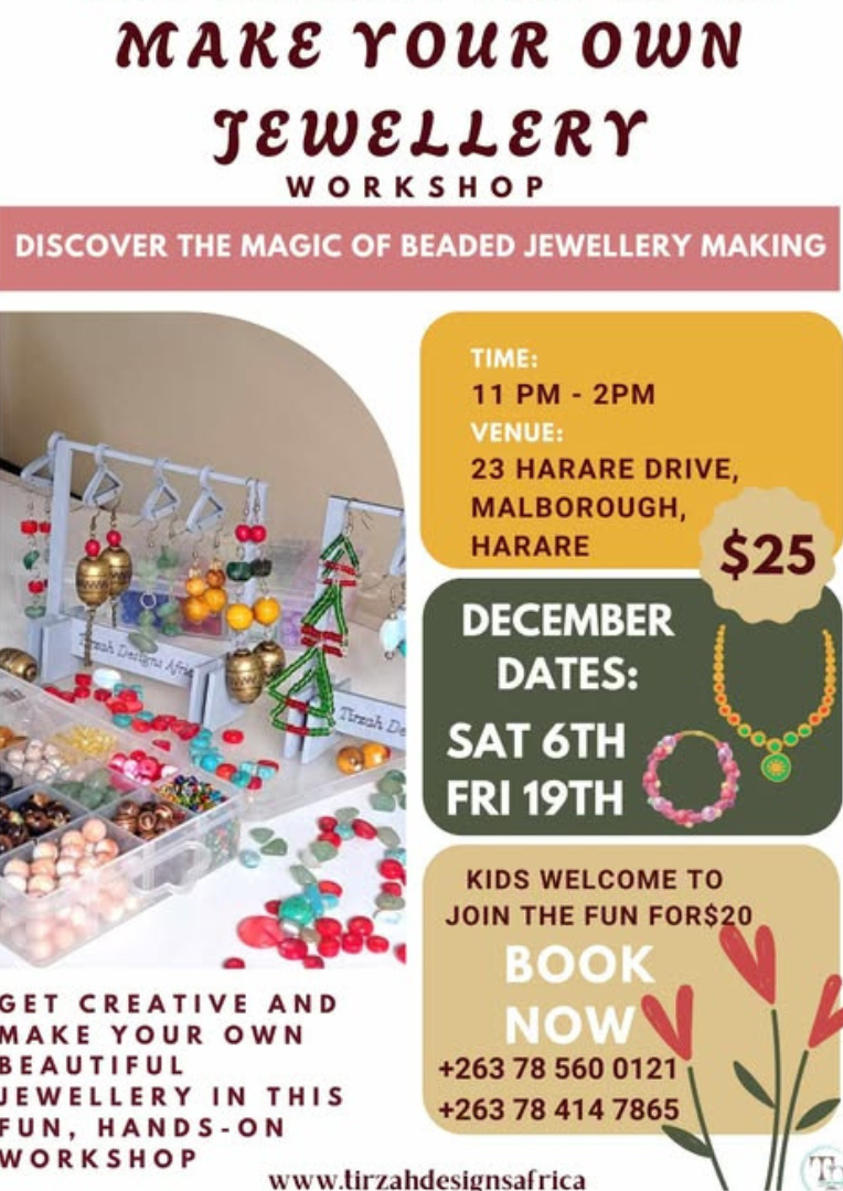 Make Your Own Jewellery Workshop Dates: Sat 6th Dec & Fri 19th Dec $25 for adults Time: 11 am to 2 pm Kids welcome to join for $20 23 Harare Drive, Marlborough Discover the magic of beaded jewellery. Book now: 0785600121 / 0784147865