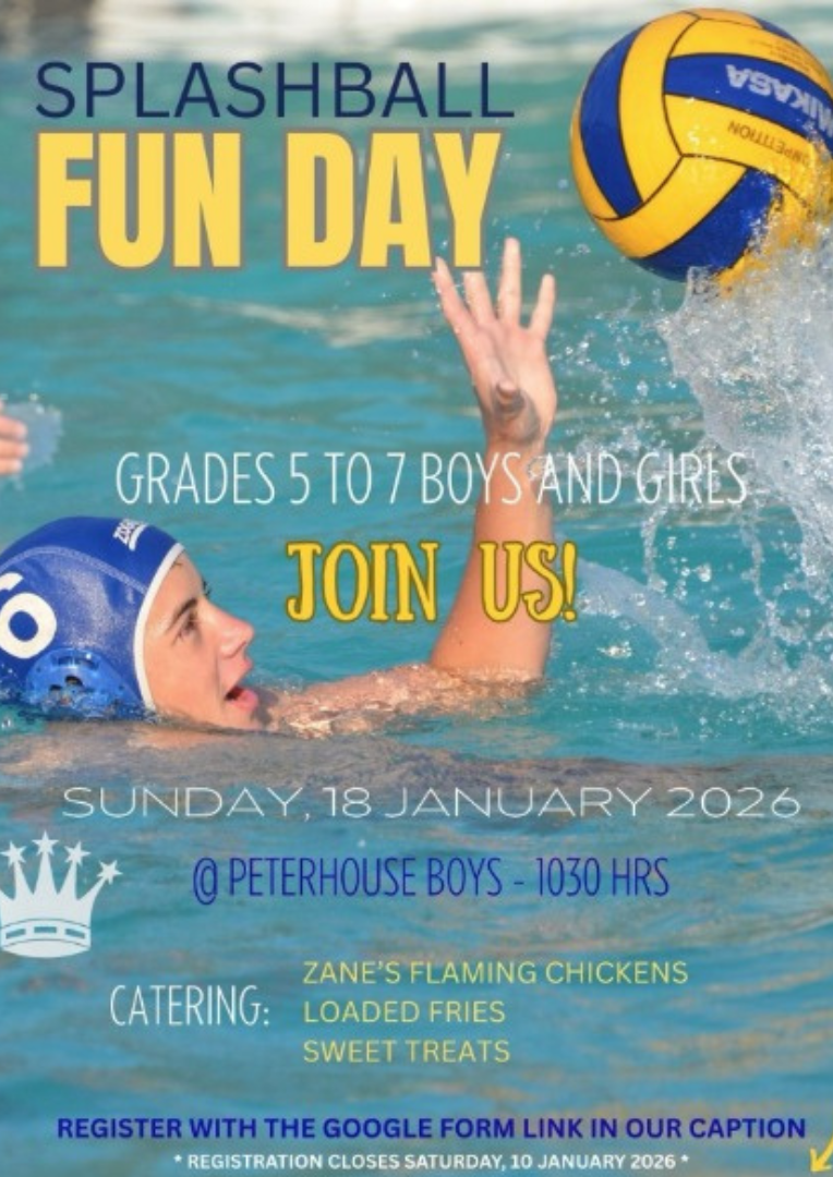 Splashball Fun Day! 📅 Sunday, 18 January 2026⏰ 10:30am📍 Peterhouse Boys. Calling Grades 5–7 boys & girls – get ready for a morning of teamwork and big smiles in the pool! We’ll take care of the fun and the food with Zane’s Flaming Chickens, Loaded Fries and Sweet Treats. 👉 Limited spaces available – register your child via the Google Form. https://forms.gle/XMALa6rNEDwA6QZW8 ⏳ Registration closes Saturday, 10 January 2026