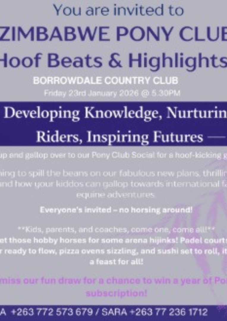 Zimbabwe Pony Club Social We warmly invite all Pony Club members, parents, and coaches to join us for our upcoming Pony Club Social. Your presence matters, and we would love to see as many families there as possible as we shape the year ahead. 📲 RSVP: Tara: +263 772 573 679 Sara: +263 77 236 1712