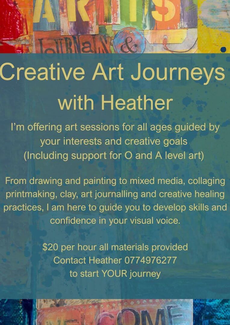 Creative Art Journey US$20 per hour. Includes all materials. For all ages, including 'O' and 'A' Level art, guided by your interests and creative goals. From drawing and painting to mixed media, collaging, printmaking, clay, art journaling, and creative healing practices. Start your journey now. Contact Heather: +263 774 976 277