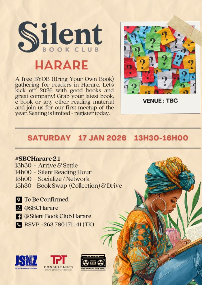 Silent Book Club Let's start the year on a high note on the 17th of January 2026. 2 weeks to go ; 100 registrations so far ; SBCHarare is back Registration is free, and we'll be announcing the venue in a few days. If you know someone who would love to attend, feel free to share this with them. Don't forget to bring "any" book you would like to read on the day.