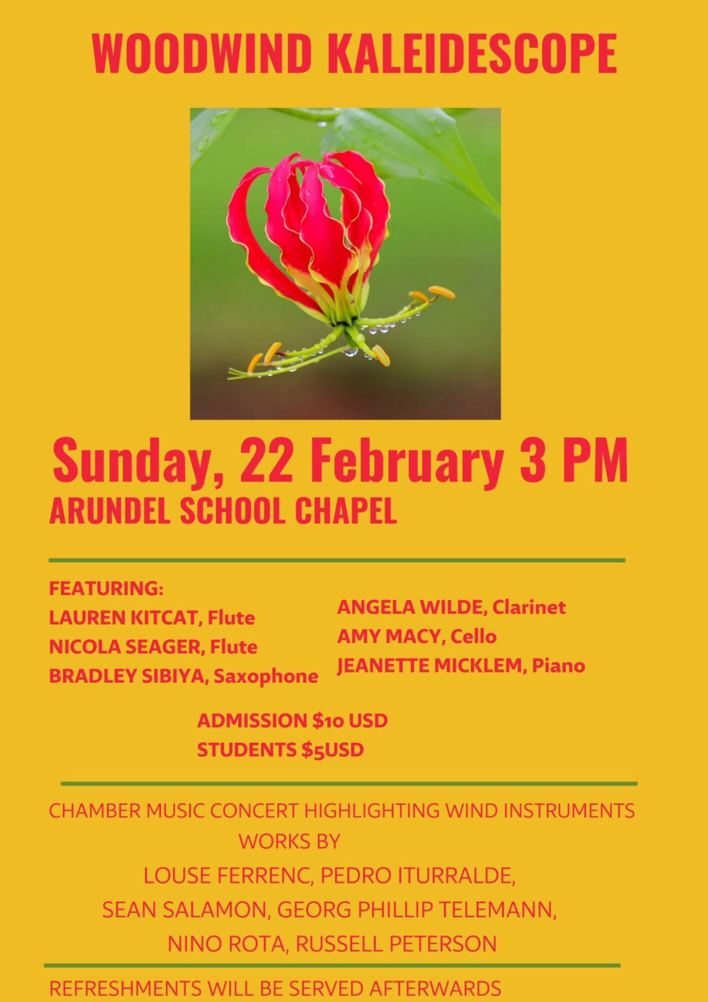 Woodwind Kaleidescope Sunday, 22 Feb, 3 pm at Arundel School Chapel. Refreshments will be served afterwards. Admission $10, students $5.