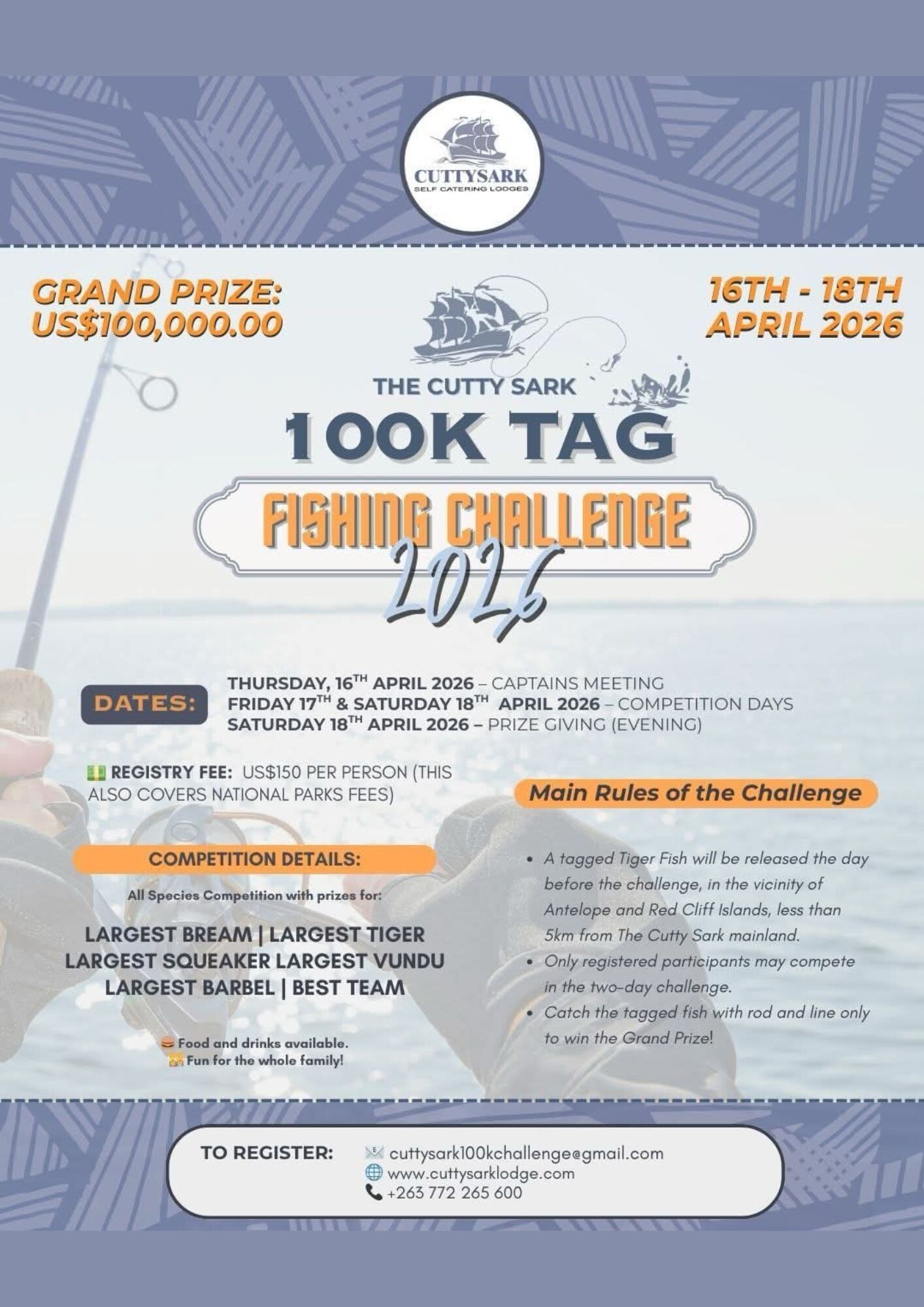 The Cutty Sark 100K TAG Fishing Challenge 2026. US$150 per person Includes National Parks fees. Cutty Sark Lodges - Kariba.Rod and line only | Register now and be part of one of Zimbabwe’s up and coming fishing events! +263 772 265 600