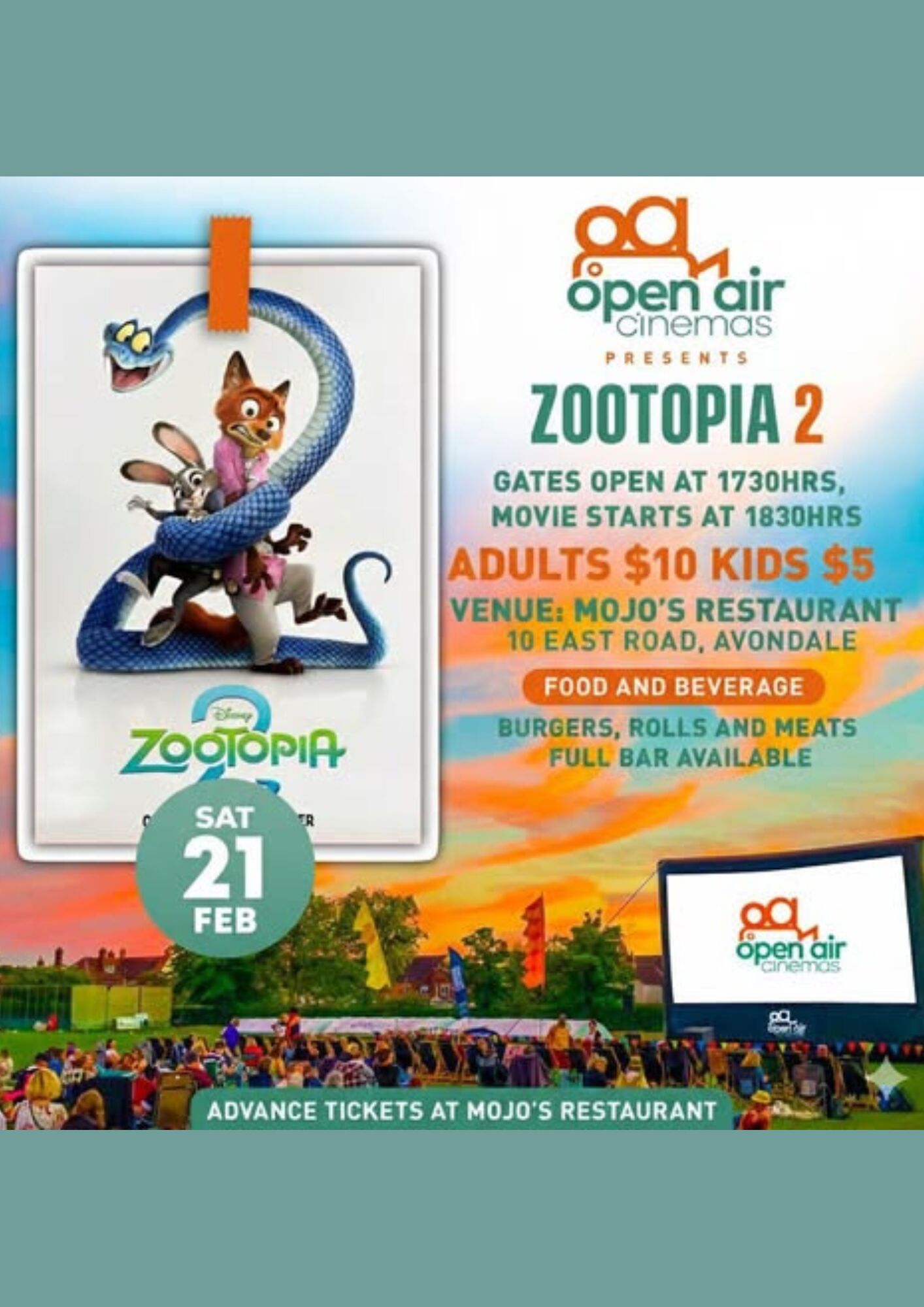 Half-term Plans = Sorted We are screening Zootopia 2 — big laughs, big adventure, and the perfect family night out under the stars. At Mojos on 21 February 2026