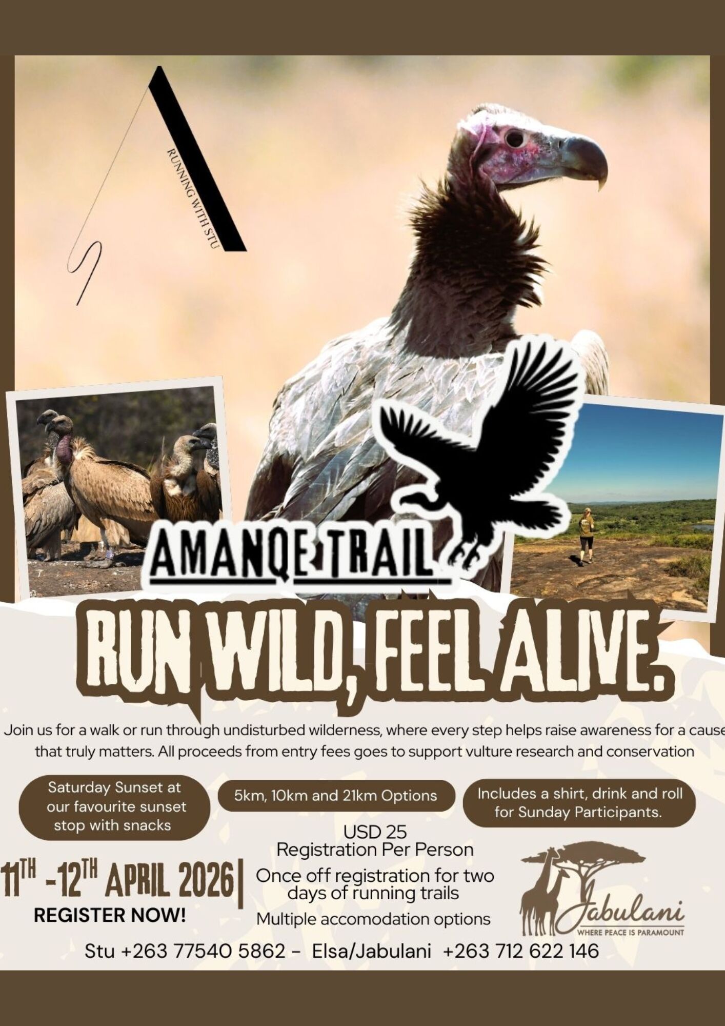 Amanqe Trail Save the date to Run Wild, Feel Alive. 11th - 12th April 2026. Register now. Join for a walk or run through undisturbed wilderness, where every step helps raise awareness for a cause that truly matters. All proceeds go to support vulture research and conservation.