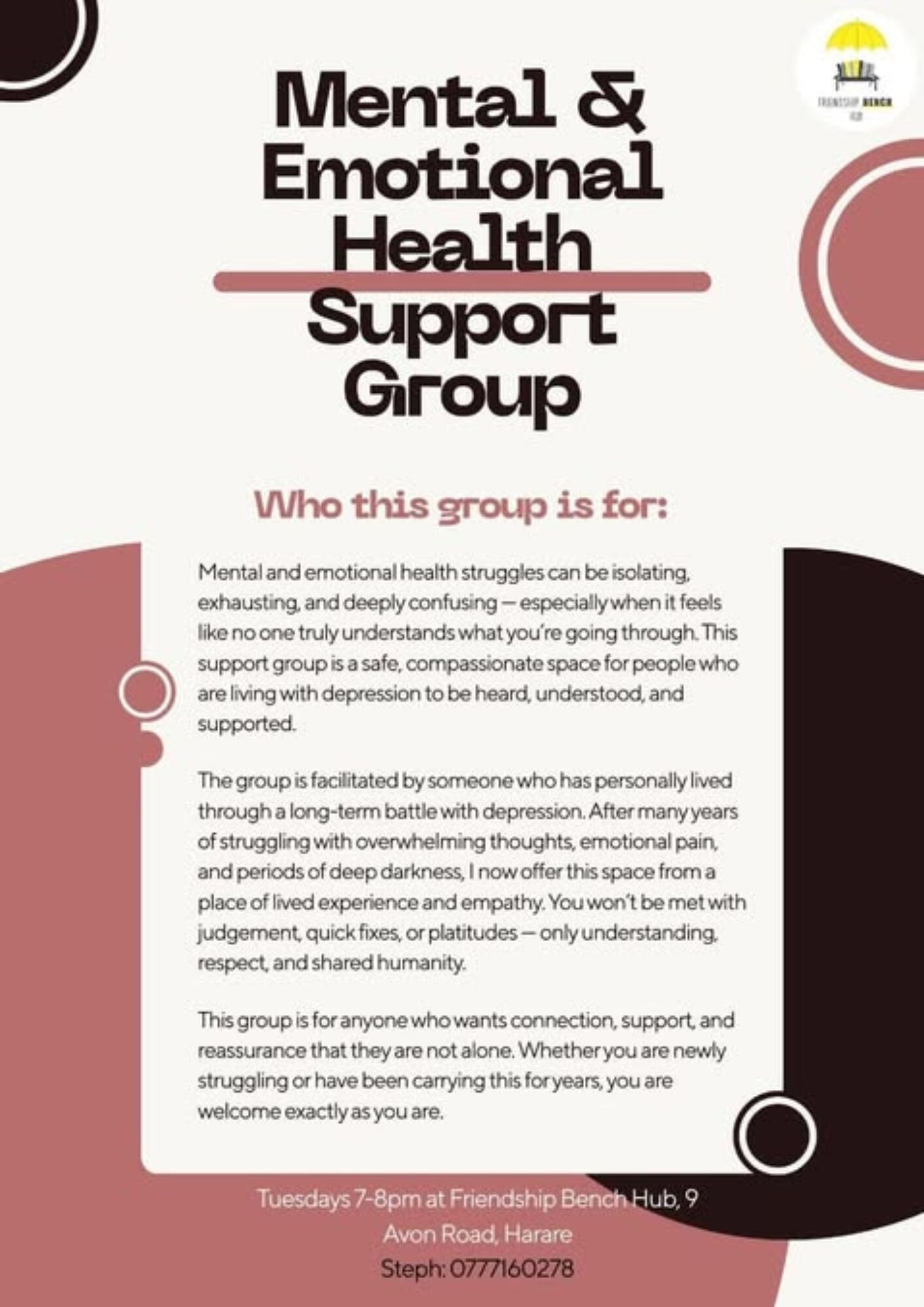 Mental health support Free and for anyone who wants connection, support and reassurance that they are not alone. You are welcome as you are. Tuesdays 7-8 pm at Friendship Bench Hub, 9 Avon Road.