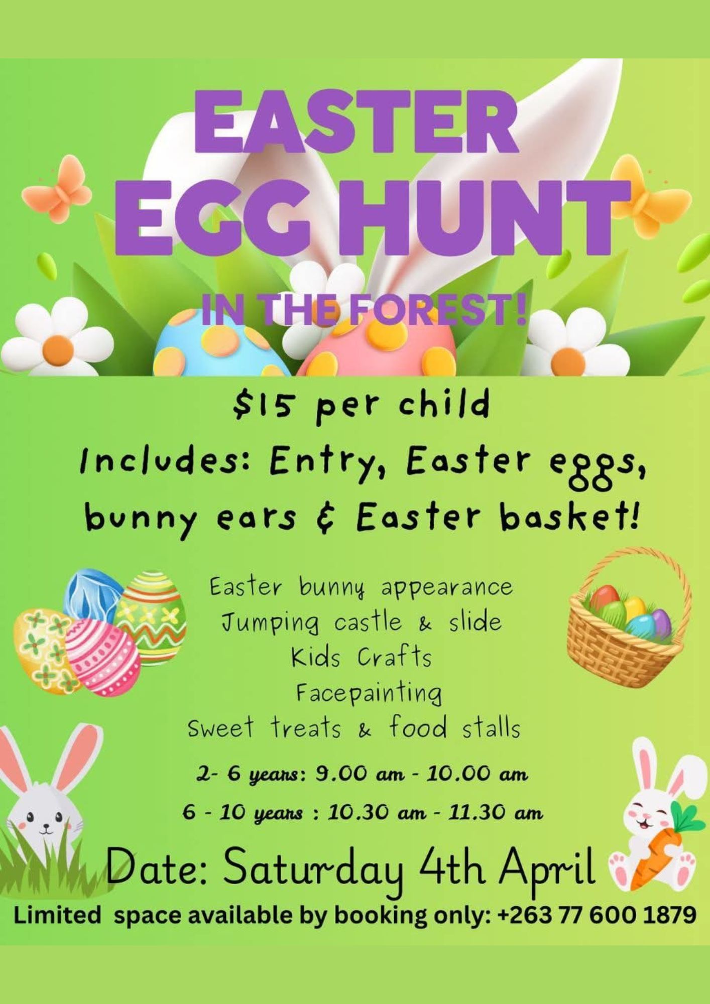 Saturday 4th April | 9:00 am - 10:00 am: 2 - 6 years old | 10:30 am | 11:30 am : 7 - 10 years old | US$15