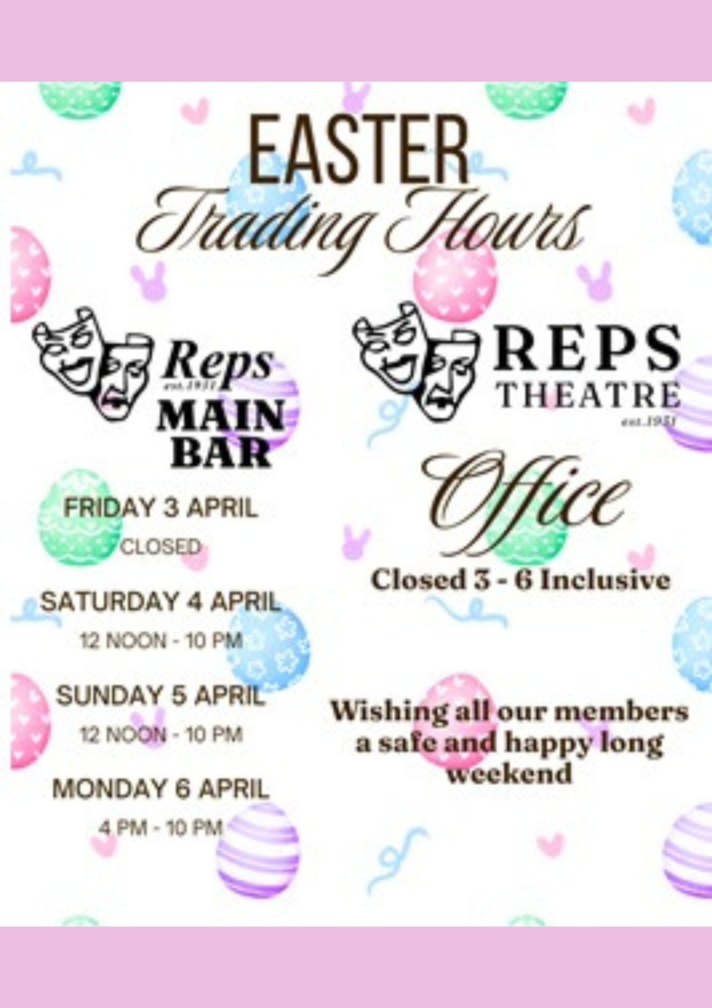Reps Theatre/Main Bar Easter Trading Hours