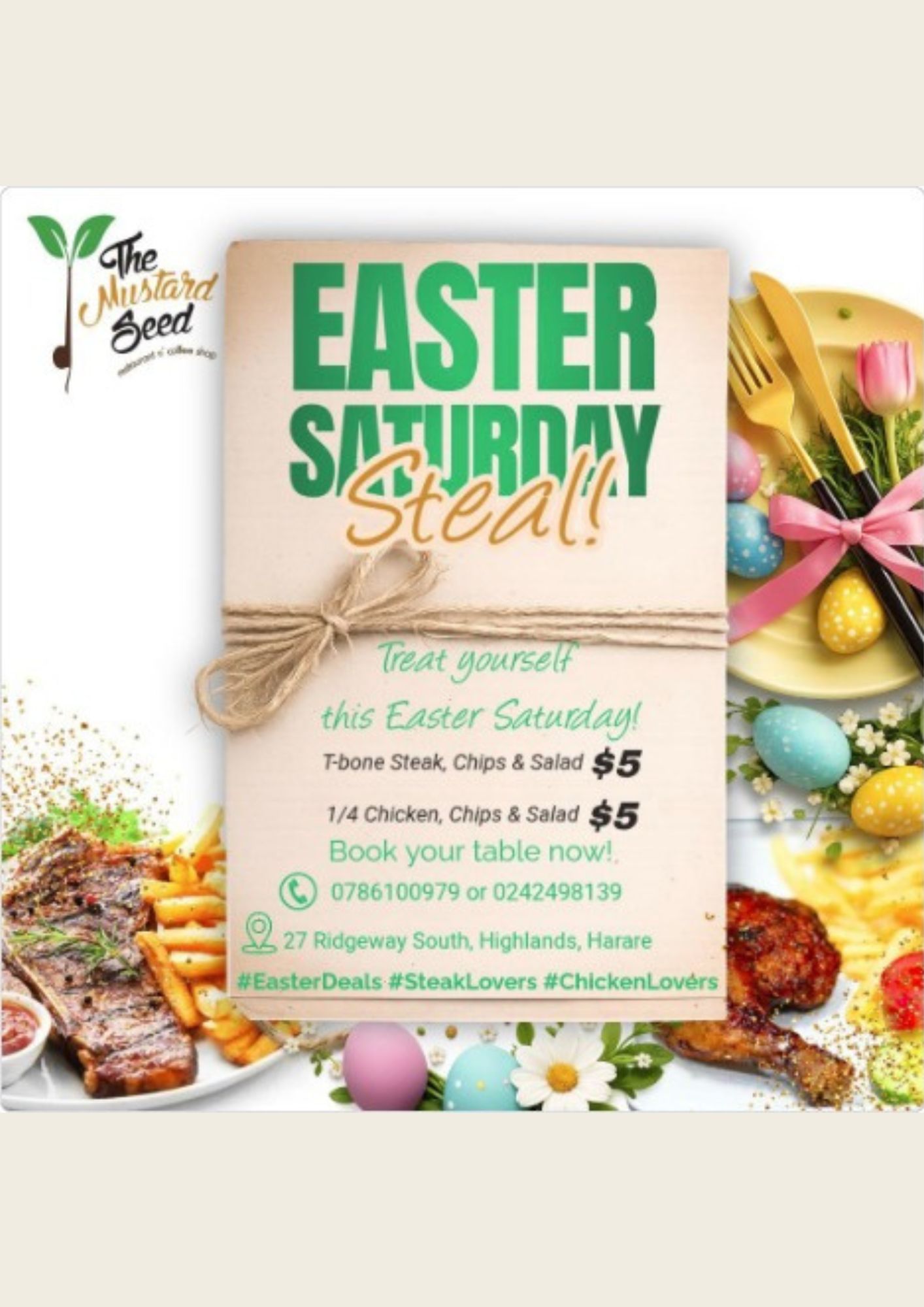 Easter Saturday just got a whole lot tastier | Book your table now: 0786100979 | 0242498139 | 27 Ridgeway South, Highlands, Harare
