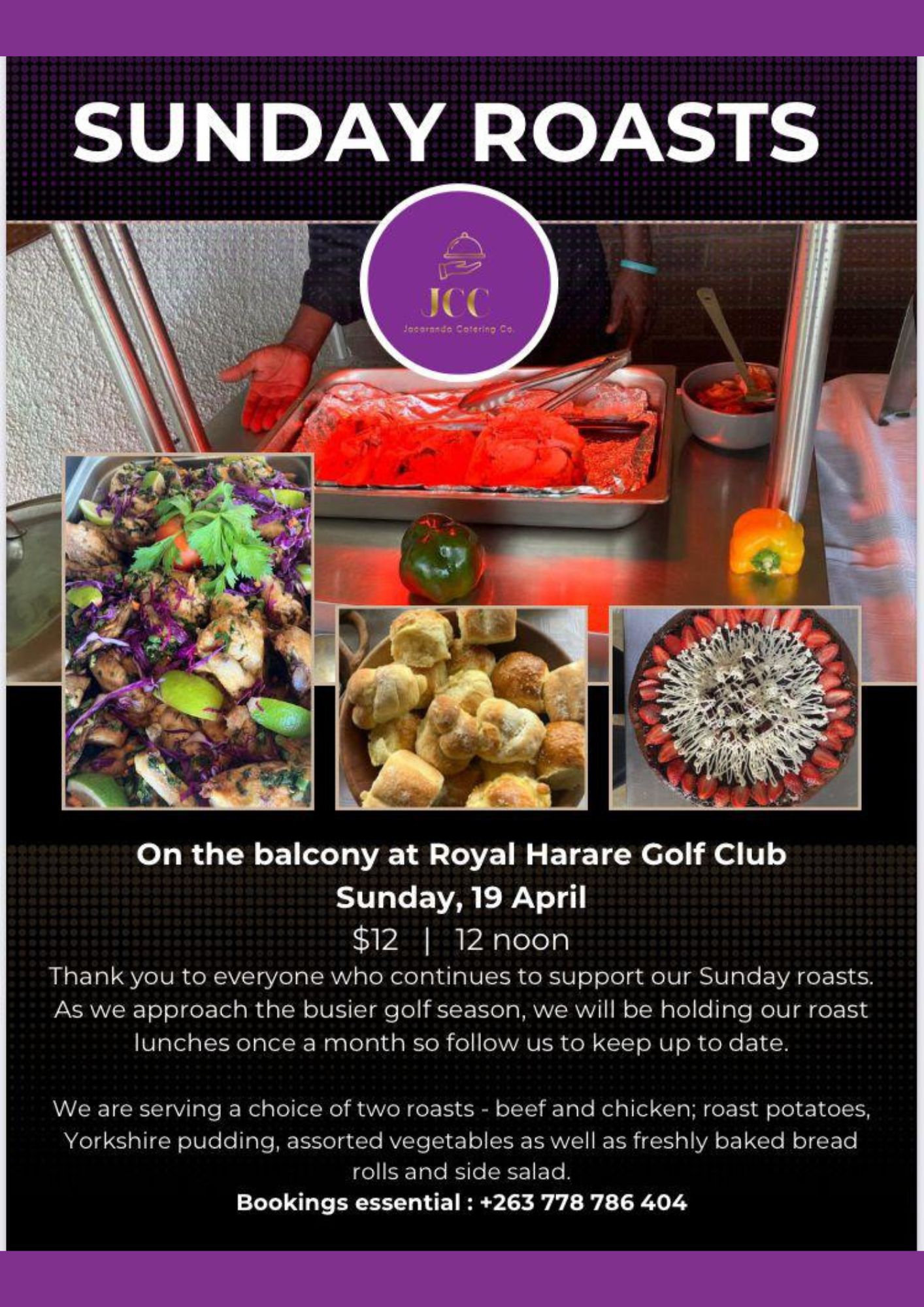 Sunday, 19th April | $12 | 12 noon | On the balcony at Royal Golf Club | Booking is essential | As the busier golf season approaches, we will be hosting our roast lunches once a month.