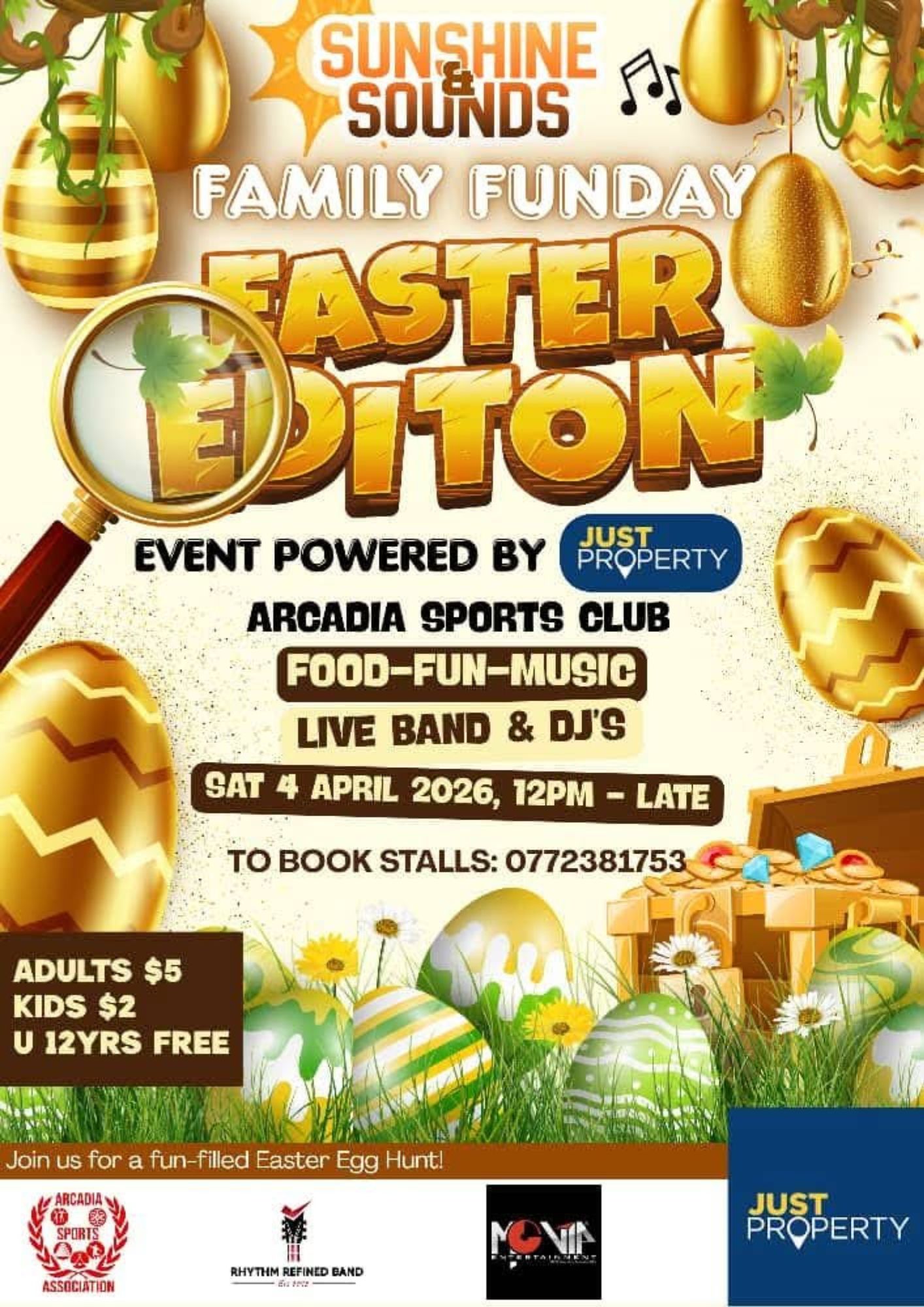 Saturday 4th April | 12pm - late. US$5 - Adults | US$2 - Teens Free - Under 12s | Arcadia Sports Club.